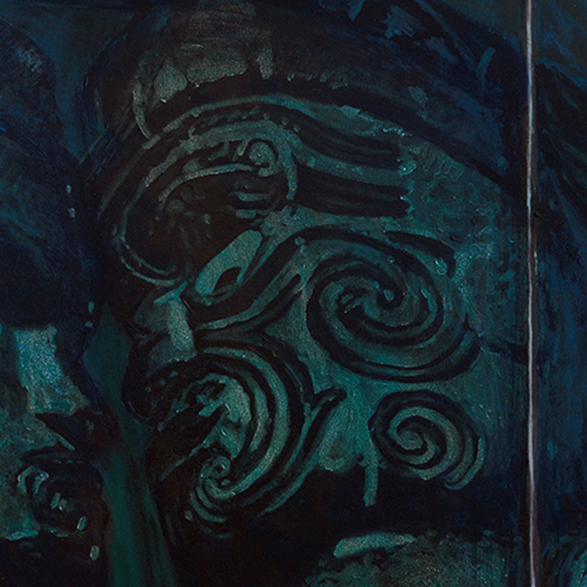 Over Jons right shoulder is his wairua. This is his soul, his life force, his alter ego, his subconscious, his non-physical being. The wairua processes and responds to Jons world, it connects with Jons ancestors, giving him purpose, direction and confidence.